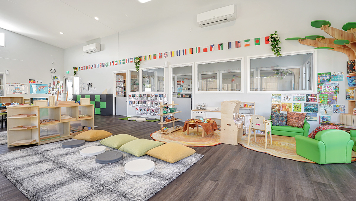 The environment integrates natural and modern materials, creating a rich sensory experience for the children. Indoor spaces are thoughtfully laid out with wooden furniture and various educational toys and materials that promote interactive learning. The outdoor areas feature shaded play structures, soft artificial grass, and different play stations encouraging physical activity and imaginative play. This preschool is designed to provide a stimulating and safe environment for children to explore, learn, and grow.